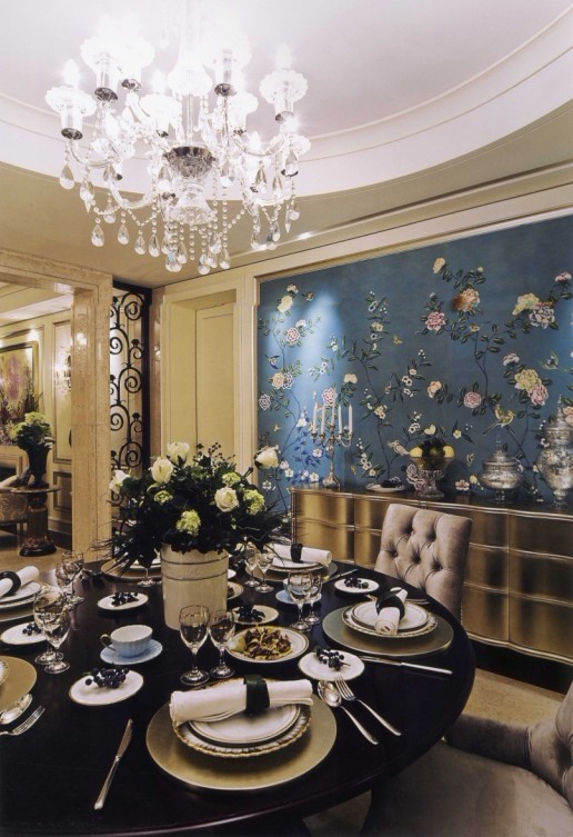 餐廳另一面的背景墻典雅,妖嬈的色彩讓人欲罷不能。華麗的施華洛奇水晶燈折射出來的光芒散在這個空間里的各個角落里。