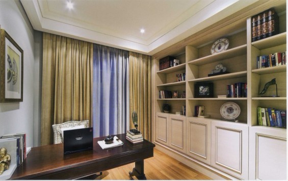 男主人的書房用簡約大氣詮釋,落地窗同書柜高度一樣,在書柜功能上采取了定制,這樣更適宜空間收納與裝飾。無論是格子擺設(shè)還是下層的柜體收藏都是井然有序的。