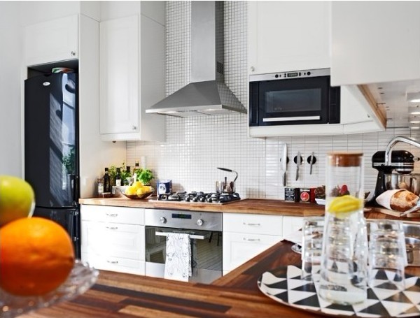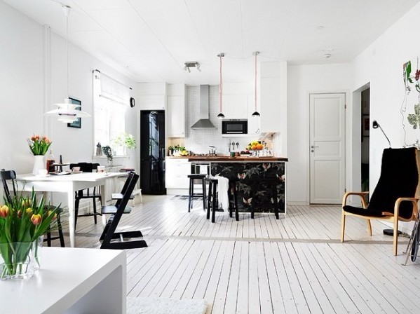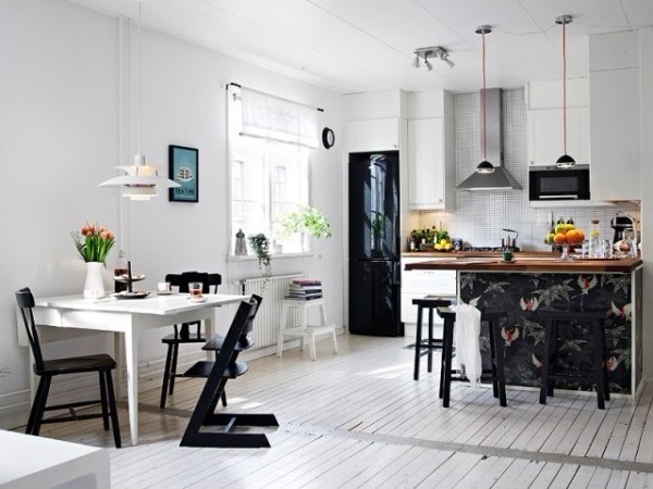 黑白配無論是在時尚之都還是設計師的筆下都是永恒的經(jīng)典。本案的墻面與地面都大量運用了白色,餐廚空間里在家具上運用了黑色,搭配的結果是非常有品位的。從擺設上我們輕易能看出這是一個三口之家,餐桌旁邊那個貼心的兒童椅讓寶貝同父母一起用餐,心理學家說這樣可以從小培養(yǎng)孩子的社會認同感。
