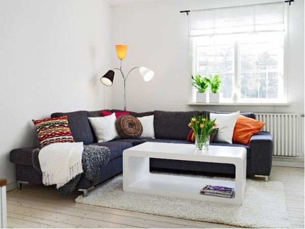 這是客廳的沙發(fā)。簡約大氣的深色配以多彩的靠墊,很輕易就有了流動感。深色系并不是冬日厚重的代名詞,在這里它不是更好的證明了嗎。
