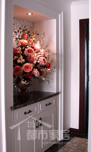新增的玄關(guān),上半部分是花形鏤空木板,下半部分是超實(shí)用的鞋柜。結(jié)構(gòu)簡單的玄關(guān)里擺上一捧**的鮮花,再打上柔媚的燈光,小小的角落里瞬時繽紛起來。