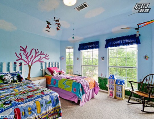 天藍(lán)色的房間酷似天空的色彩,整體色調(diào)清新,淡雅。天藍(lán)色的背景墻面搭配米色軟木地板,完全符合清新自然的特質(zhì)。兩處大大的玻璃窗透視著外景綠色美麗,到處都可以聞到春夏季自然的味道。為了讓孩子更多的感受到大自然氣息,在屋頂設(shè)計(jì)上描繪出朵朵白云,跟天藍(lán)色的空間相稱,自然別出心裁,簡(jiǎn)單卻美好的手繪設(shè)計(jì)。