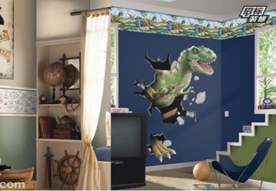 男孩子總是愛(ài)充滿冒險(xiǎn)精神,喜歡海盜,奧特曼,可能還喜歡恐龍島等。那么,在設(shè)計(jì)讓就滿足男孩子們無(wú)窮的夢(mèng)幻和想象力吧!這款手繪墻是不是很逼真呢?色彩的搭配凸顯出逼真的恐龍,幾乎到了以假亂真的效果。