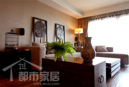 客廳古香古色的陳列品是最大的亮點(diǎn)。近處帶一對(duì)銅耳的老式木箱、彩陶花瓶、竹制鳥籠都是典型的中式風(fēng)格配飾。遠(yuǎn)一點(diǎn)的亞麻色沙發(fā)和幾何形茶幾屬于現(xiàn)代簡(jiǎn)約風(fēng)格。相近的顏色讓跨越時(shí)代的兩種風(fēng)格完美結(jié)合在了一起。