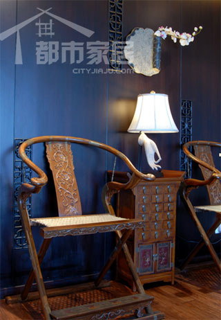左側(cè)兩張圈椅的裝飾功能大于實(shí)用功能。門里是主臥的起居室。