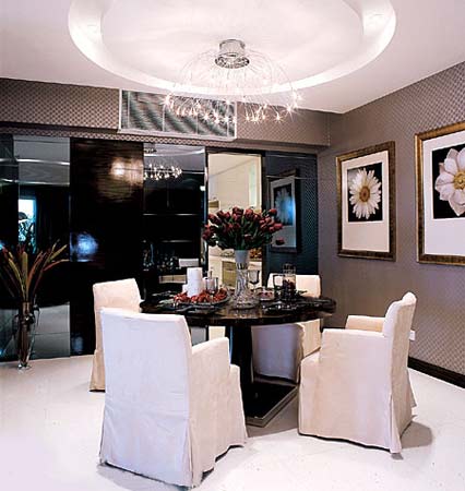 餐廳與客廳用圓形的天花燈槽增強(qiáng)了空間的獨(dú)立感,弧形的座燈與圓點(diǎn)圖案的地毯令整個(gè)空間氣氛沉靜卻不失活潑。臨空而懸的水晶珠簾是客廳的生輝妙筆,把飯廳與客廳區(qū)分開(kāi)來(lái),然而有隱約可見(jiàn)對(duì)方,給居室布置了一種隔而不斷的布局。