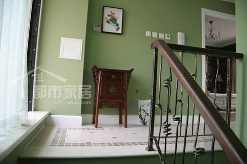 上樓上瞧一瞧去。和別處不同,樓道是泛著灰調(diào)子的綠色空間,柔和而雅致。顏色的運(yùn)用很重要,就拿這綠色來說,它經(jīng)常被運(yùn)用在歐式別墅中,已經(jīng)成為了一種經(jīng)典、正統(tǒng)的搭配。然而太艷會(huì)顯得淺薄庸俗,太暗又會(huì)顯得陰郁沉悶,拿捏得恰到好處才是設(shè)計(jì)師的功力所在。不看別的,光是這綠色的調(diào)配就能傳達(dá)出房子的源自經(jīng)典的品味