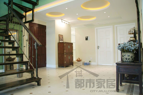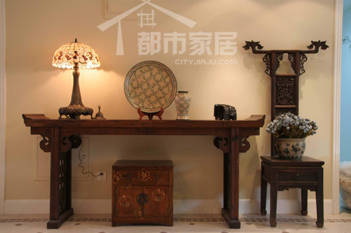 這是初進(jìn)門時(shí)展現(xiàn)在我們眼前的情景。明亮的日光透過紗簾來,整個(gè)房間沒有太多隔斷,感覺上開闊通透極了。左側(cè)的一組中式家居配飾搭配很醒目,紅木條幾、小木柜、瓷盤瓷瓶、老式臺(tái)燈以及一把靠背超高的凳子,這租搭配其實(shí)是隨心所欲而為之的,卻顯然成為了別墅入口處最隆重的一角。