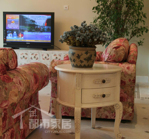 和玄關(guān)不同,客廳呈現(xiàn)出明顯的西式風(fēng)格。粉色花朵圖案的沙發(fā)有著甜膩膩的女性氣質(zhì),讓人聯(lián)想起女主人熱情的邀請(qǐng)和溫柔的款待。白色的雕花小矮柜氣質(zhì)優(yōu)雅,它的白色調(diào)和了沙發(fā)的甜膩感,給人眼前一亮的感覺。電視柜則像是沙發(fā)和小矮柜的中和品,有著白的底色和粉粉的手繪圖案。這一切搭配在一起散發(fā)出歐式田園的浪漫感覺。