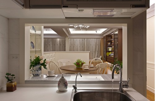 廚房視覺很開闊,在廚房內(nèi)可看到餐廳區(qū)域,徹底修飾封閉式隔間墻的滯礙,營造出休閑感的主調(diào),因此在餐廚空間連結(jié)上,半開放式送餐口讓景深由小至大、由大至小,變化出視覺樂趣。