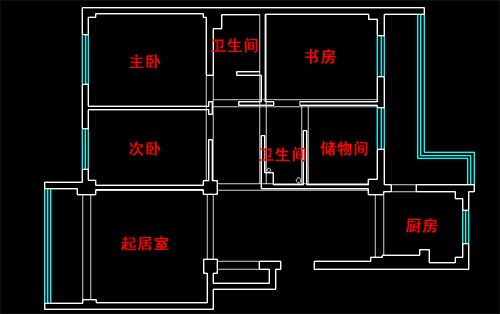 依照裝飾柱左側(cè)的直線,把書房的墻面內(nèi)縮,減小書房空間。同時,拆除儲物間,將儲物間一位為二,一半合到書房當(dāng)中,另外一半留作餐廳區(qū)域。