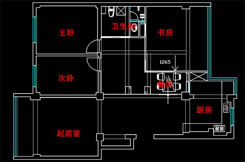 書房右側(cè)陽臺L型下部空間做到廚房當(dāng)中,從而加大廚房面積。這樣就能擺下業(yè)主鐘愛的一套整體櫥柜了。