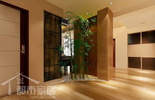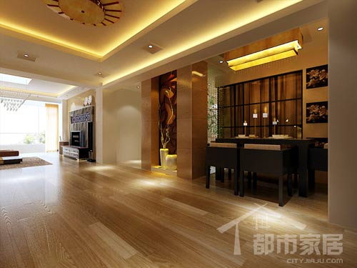 上圖中的兩盞大燈是一大特色,首先要看一下地板的顏色,這是一種深黃色系花紋的木地板,再來看兩盞大燈,設(shè)計師告訴都市家居記者:“這兩盞燈是仿舊羊皮效果的燈具,目的就是和地板的色彩、樣式相呼應(yīng)。”同樣的彩色,卻傳遞給人亦新亦舊的強烈反差感。