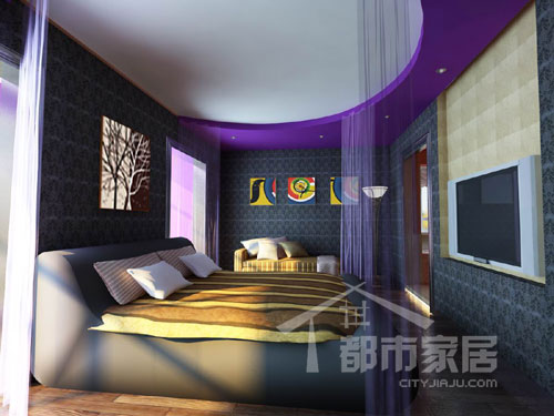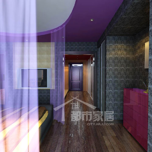 小編穿門而入,大家眼前紫色的門就是剛才花色斑駁門的背面哦。臥室的采光條件也不算好,但是設(shè)計師并沒有配置主體照明的燈,而是僅僅在天花板上使用了幾盞小射燈,看來是想把黑影憧憧的感覺延續(xù)到底。黑色的印花壁紙像極了隱藏著神秘圖案的三維圖,叫人越細(xì)看就越迷惑。長長的走道右側(cè)全部是儲物空間,左側(cè)則是臥室與衛(wèi)生間。睡床對面的電視墻背面即是衛(wèi)生間的臺盆和浴室柜,女主人的瓶瓶罐罐都放在那里。