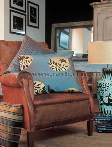 為高級而古老的真皮坐椅搭配靠墊,具有中國詩畫韻味的圖案成為獨特而高貴的選擇。清雅的灰色透露著濃縮的文化韻味,與另一個灰色緞面靠墊搭配起來更顯高貴,而坐椅旁邊的條紋靠墊向古老的氣氛中投入了古典的西方元素,讓整個角落的風格多元起來。