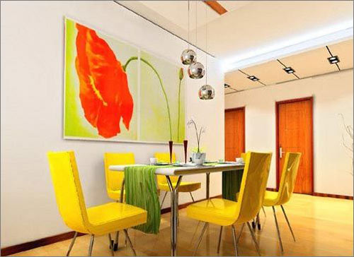 新造型閃亮登場:艷麗的大型掛畫一掃蒼白氣氛,黃艷艷的椅子填補了色彩的空洞,別致的吊燈帶來幾分靈動,充滿希望的青綠色桌布令人食欲大開。