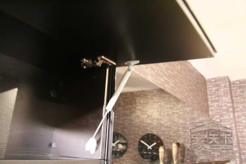 產品亮點:抽屜的滑軌采用下部承托的方式,沒有外露保證了整體的美觀。只是抽屜不能夠全部拉出,會給取物帶來麻煩;上方的吊柜采用的是上翻式,支撐桿為德國suspa品牌,只需輕輕一抬,便可自動開啟,十分方便。