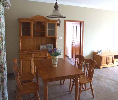 這是就餐區(qū),純實木的家具簡潔而富有生活氣息,桌上依然少不了一盆綠色植物(不好意思,這植物在下實在也叫不出名字呀)。