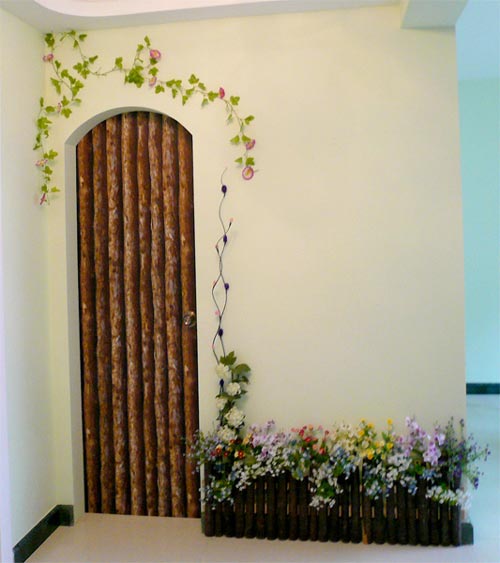 通往臥室的門,鐵藝的轉(zhuǎn)角臺和客廳的鐵藝沙發(fā)完成了整個空間風格的統(tǒng)一。臥室門是普通的光板門,用小小的木花讓簡單的門變的豐富起來,彩繪,用金色的丙烯顏料,增添一份豪華的感覺