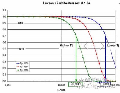 實(shí)際上,LED壽命問(wèn)題主要是由于長(zhǎng)期在高溫下工作而形成的問(wèn)題。在不同結(jié)溫時(shí)的壽命如下圖所示: