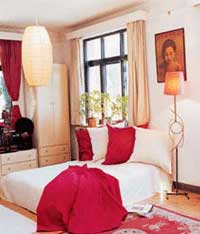 喜歡這個臥室的原因,是因為它既古典又現(xiàn)代。房頂掛著的紙燈籠,墻上30年代的上海女子,這些細(xì)節(jié)仿佛都讓人感覺回到了那個年代。但是請注意哦,臥室中最重要的家具——床,是沒有床腳的哦。是不是有點(diǎn)榻榻米的感覺?而白色和紅色的鮮明搭配又好像暗示著主人是個性情女子哦!
