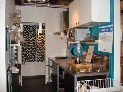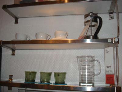 另一面墻上的掛桿,微波爐手套、圍裙等廚房用品就可以掛在這里,方便又整潔。這個掛鉤的價錢也不貴,僅花14.9元就可以在宜家里買到。