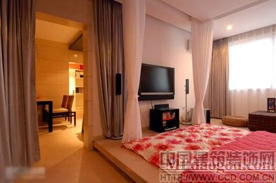 在擺放床的地域處,裝修出10公分左右高的木質(zhì)地臺,相應(yīng)地選用較低矮的床。其效果是:使睡眠區(qū)的環(huán)境更為清潔;地臺烘托中的床與人更有一種“精品”的藝術(shù)美感;尤其是花梨木質(zhì)的地臺還可給人以芬芳的氣息。