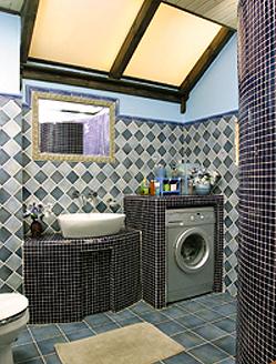 基調(diào)是一片蔚藍(lán),藍(lán)色的馬賽克、灰藍(lán)色的地磚。因?yàn)榭臻g相對較大,所以主人就有了很大的發(fā)揮余地,為洗衣機(jī)量身定做的小臺,上面還可以放一些雜物,弧形的洗手池、手盆與同樣造型的整體浴房呼應(yīng)著,“整體浴房”其實(shí)是主人自己用磚砌出來然后貼上藍(lán)色馬賽克做成的。大面積使用馬賽克,并在頂部鋪上了溫暖的桑拿板,刻意做成的斜屋頂式燈箱是主要光源,設(shè)計(jì)的本意是希望給這個(gè)沒有一扇窗子的衛(wèi)生間,帶來一種有天窗的錯(cuò)覺。