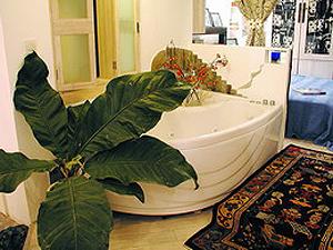 要在一個(gè)四十幾平方米、已經(jīng)幾乎沒有浴室的小房里享受沐浴的快樂是不可能的嗎?答案并非全否定,這個(gè)大膽的“浴室”干脆設(shè)在了客廳里,大大的按摩浴缸盤踞了一個(gè)角落,并成為客廳與臥室功能分區(qū)的隔斷。在“浴室”與廚房之間還像模像樣地開了個(gè)小窗子,很可愛。誰說小就意味著不健全?全看個(gè)人怎么做。