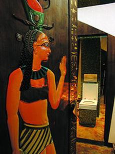 這個(gè)衛(wèi)生間點(diǎn)睛之處在于門,手繪的埃及傳統(tǒng)人像,做出了浮雕的效果,花邊是埃及的壁畫上的象形文字,厚重的大門配以手感很好的金色把手,讓人在推開之前對里面的情形充滿了想像。