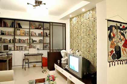 第九,可在客廳角落以簡單的桌椅營建一個(gè)工作空間,再以屏風(fēng)來遮擋桌椅。