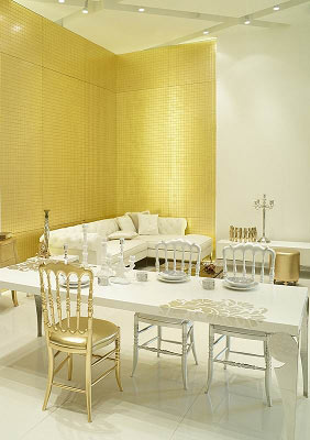 其中,金銀的光澤由于牽連著實(shí)物的價(jià)值,比較容易獲得解釋。值得注意的是人們檢驗(yàn)金銀的標(biāo)準(zhǔn),即“成色”,所考究的是它們的純度,猶如人們檢驗(yàn)一個(gè)人的品質(zhì)或者出身,或者諸如此類的問題一樣。尤其自近年以來,純用金色或銀色,而不是將它們拿來做鑲邊的做法日趨流行,當(dāng)然可以說這是金融危機(jī)之下人們尋求補(bǔ)償心理的某一側(cè)面反映,卻也可以說是在一個(gè)變幻而浮華的世界里,人們重新回到了古老的永恒品質(zhì)的路途上。不管怎么說,還有什么能比真金白銀更無需修飾、無需任何其他的附加物,自己便能證實(shí)自身的價(jià)值呢?