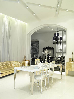 在新開幕的JIAconcept尊家家居的旗艦店內(nèi),只設(shè)黑、白、金、銀四個(gè)展示區(qū),復(fù)古風(fēng)格家具在這四種色調(diào)下看起來好似一幅幅現(xiàn)代摩登場景。眩目的金銀光澤帶來富有沖擊力的奢華視覺;黑與金的沖撞,帶著些許妖媚;而柔美、安嫻的白色,褪去了金銀光澤中的世俗煙火氣,略加少許淡藍(lán)色的點(diǎn)綴,幾乎呈現(xiàn)出某種天使般的圣潔氣息。
