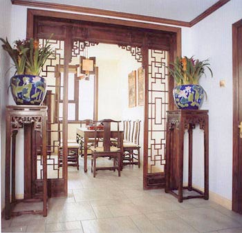 新中式風(fēng)格非常講究空間的層次感,室內(nèi)多采用對(duì)稱式的布局方式,依據(jù)住宅使用人數(shù)和私密程度的不同需要做出分隔的功能性空間,一般采用“啞口”或簡(jiǎn)約化的“博古架”來區(qū)分,“雕花門片”也是常用的分隔形式;在需要隔絕視線的地方,則使用中式的屏風(fēng)或窗欞,通過這種新的分隔方式,使單元式住宅展現(xiàn)出中式家居的層次之美。
