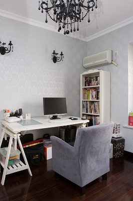 而書房又是另一種腔調(diào),白色基礎(chǔ)上的Art Deco風(fēng)格。門是隱蔽在客廳電視柜后的背景墻內(nèi)的,左側(cè)一邊推開(kāi)來(lái),先看到兩塊半透空的簾子,自天花板至地板垂直懸掛,不同的花紋,同樣薄而輕飄的質(zhì)地,做了視線上的一個(gè)小小阻隔。轉(zhuǎn)入屋內(nèi),右手邊一張裝飾風(fēng)格的邊柜,白色油漆底下還能看見(jiàn)木材的紋理;左手邊靠墻一張書桌,造型凹得很別致;書桌右側(cè)靠窗是一個(gè)白色書架,同樣帶一點(diǎn)裝飾風(fēng)格;書桌左側(cè)一面墻全部做成了衣柜,與邊柜同樣風(fēng)格,作為這間屋子的收束。與風(fēng)格變化相應(yīng)的是,這間屋子里的色彩也柔化了一點(diǎn):黑色被換成了灰色,包括一個(gè)單人沙發(fā)、一幅窗簾。窗簾是帶閃的桑蠶絲質(zhì)地,底下一個(gè)飄窗,鋪白色墊子,林琳說(shuō)這個(gè)房間“好看,但就派不出太多用場(chǎng)“。其實(shí)這跟書是同一個(gè)道理:讀書能直接派上什么用場(chǎng)呢?可是整個(gè)兒的讀書氛圍本身就是有意味的。