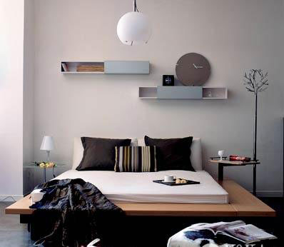 利落的線條充滿整個(gè)房間,原木色的寬邊床可移動的小幾設(shè)計(jì)周到,背景墻上錯落安置的CD架,利用材料的多元變化和幾何造型的有機(jī)融入,讓視覺呈現(xiàn)出舒緩的起伏,金屬衣架豎立要床旁,既實(shí)用又強(qiáng)調(diào)了空間的設(shè)計(jì)感。