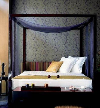 臥室中色調(diào)柔和的布藝床頭莊重典雅而不乏輕松浪漫的感覺,與灰紫色暗花紋壁紙和深紫色的格紋地毯相互呼應(yīng),多層次的色彩變化,中和了深色家具帶來的冷靜,帶有灰度的柔和色調(diào)讓整個(gè)房間停留在雅致迷人的氛圍里。