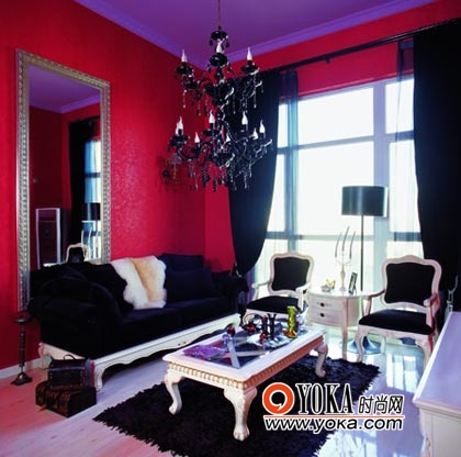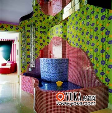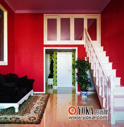大廳的墻是紅色,很扎眼,但家具是白色的,窗簾是黑色的,這幾種顏色搭配起來特別鮮明。樓道吉米選擇綠配紫,屬于對撞的顏色里最沖突的,吉米說只有這樣才會把主題包括主人的個性充分表達出來,非暖即冷,反正不會選擇中庸。