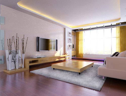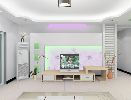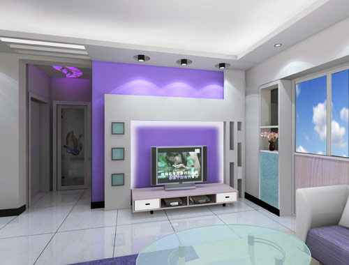 以亮麗的色彩和各種飾線來充實點綴,客廳內(nèi)家具擺放要簡潔卻不失單調(diào),電視墻墻體的主色調(diào)可用橙色、天藍色、紫色等“跳”一些的亮麗色彩,用色可大膽、巧妙,也可用兩種對比強烈的色彩搭配。對于追求個性的年輕人來說,將電視墻面涂成自己認為夠酷夠爽的色彩是不錯的選擇。墻上采用幾何造型的飾線和精美材料組合運用,體現(xiàn)現(xiàn)代化的裝飾風(fēng)格。