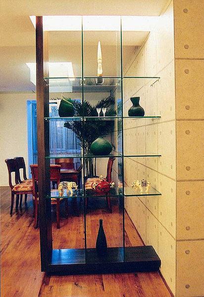 所以,折中的辦法是用玻璃屏風(fēng)來做間隔,用磨砂玻璃這樣半透半遮的材質(zhì),既在空間上起到間隔的作用,又可以借用半透半遮的特殊材質(zhì)所帶來的空間沿展的視覺效果。這樣既可以防止外氣從大門直沖入客廳,同時也可令狹窄的玄關(guān)不顯得太逼仄
