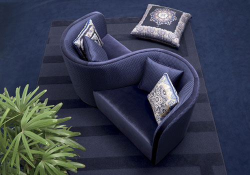 小沙發(fā)Face To Face,藍(lán)色絲絨面料,兩個(gè)相連的座位營(yíng)造和諧浪漫的氣氛。
