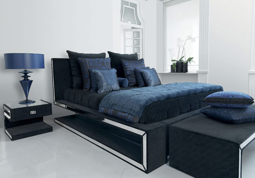 雙人床和腳凳Greca,全部采用金屬結(jié)構(gòu),外覆絲絨面料。雙人床參考價(jià)格140000元,床頭柜參考價(jià)格27000元。臺(tái)燈Clessidra采用黑色水晶底座和真絲燈罩。參考價(jià)格25000元