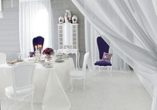 餐桌遠(yuǎn)端擺放實(shí)木扶手椅Queen Dotsenko:白色上漆結(jié)構(gòu),軟包椅面和靠背外覆藍(lán)色天鵝絲絨面料。參考價(jià)格60000元。餐桌上擺放與Rosenthal合作生產(chǎn)的手繪陶瓷餐具Flower Fantasy。價(jià)格580元起。