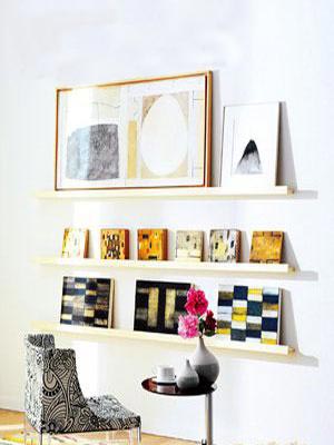 可以用在墻面上釘層板的方法解決掛畫的問題,長度依墻面而定。這樣,你不需要把墻面摧殘得千瘡百孔,還方便根據(jù)心情隨時調(diào)整畫的位置或者更換新購置的作品。畫的擺放要根據(jù)尺寸和內(nèi)容,過于零亂或者死板都影響效果。