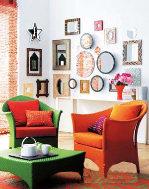 旅行時收集的裝飾框,不必為風(fēng)格、材質(zhì)和顏色的沖突而擔心,把它們鑲嵌上鏡子,集中展示在墻面上,保證成為居室中的亮點。