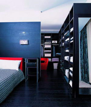 可以在臥室死角或者床頭背后設置這個衣帽間,開放式的方便物品取放,考慮到保潔問題,可以用布簾或竹簾當門,拉籃選擇旋轉式的會更省地。