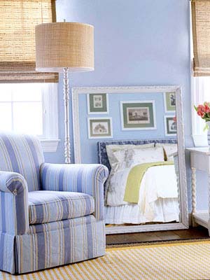 使窄狹的房間顯得寬些———在地板上橫向使用直線圖案,或者在地板上用淺色或深色瓷磚鋪排棋盤式圖案,按上述方法處理水平結(jié)構(gòu)特征的墻面和窗戶。