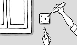 在處理電燈開(kāi)關(guān)與插座周邊位置時(shí),先關(guān)掉電源,以正常方式貼平壁紙,覆蓋過(guò)這些地方,然后再將蓋過(guò)開(kāi)關(guān)與插座部位的壁紙自中央向四個(gè)角落切開(kāi)。接著松開(kāi)螺絲,以切開(kāi)部位的紙緣折入蓋內(nèi),再裁掉多余的部分即可。