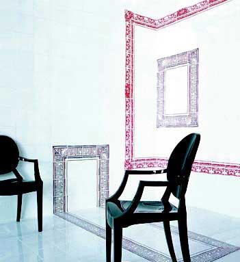 瓷磚上的手繪圖案看起來像是畫框又像是窗戶,將空間重新分割、延伸,使視線與思緒都得以拓展。與啞光白色瓷磚和拋光白色瓷磚均可搭配使用。