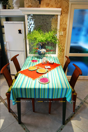 廚房門口便是餐廳,鋪上綠色條紋桌布,再配上藤藤制餐椅和花瓶,營(yíng)造了清爽舒適的環(huán)境。墻壁鋪貼了鏡子馬賽克,人在家中的活動(dòng)都能在鏡中顯現(xiàn),使居室有動(dòng)感和生機(jī)。